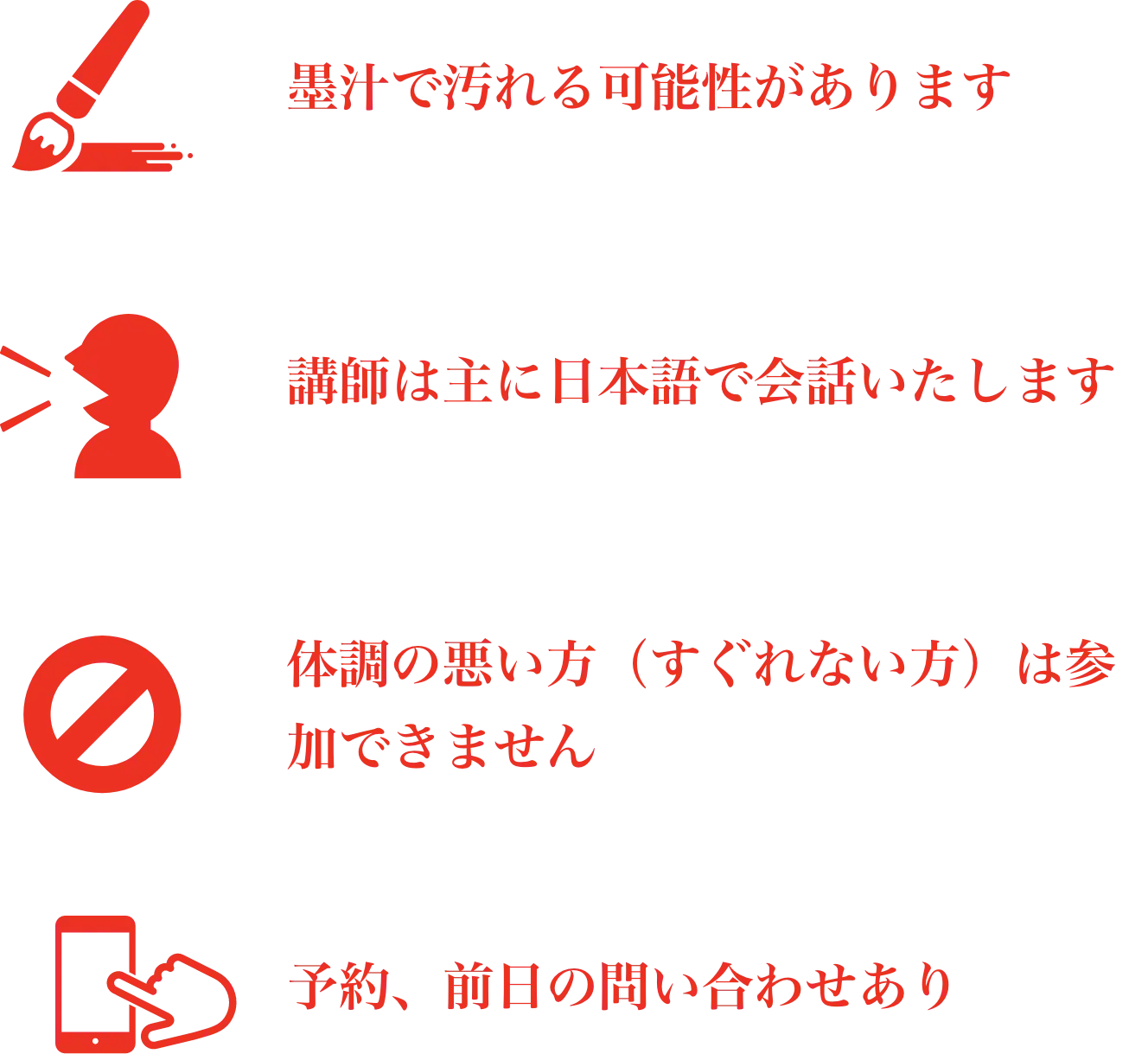 書道は約2000年の歴史を持つ伝統芸術です。中国から伝わり、貴族の娯楽・学問、そして芸術として今日まで受け継がれて来ました。墨と筆を使い幻想的な絵のような文字を書いたり、緻密で精密で精密な経典を書くことができます。情報社会の時代ですが自分の手で文字を書くという行為はコンピューターやスマートフォンにはない意味を持っています。日本に来たからには是非書道を通して日本の伝統を体験してみませんか?